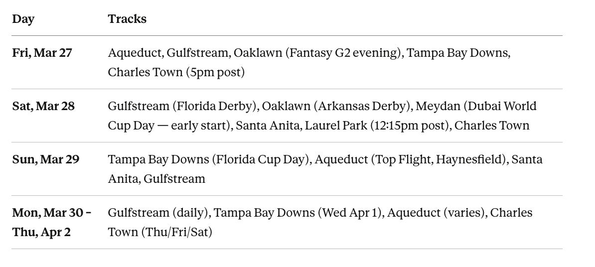 This is the biggest racing weekend of the year so far. I’m not being dramatic. Three major Derby preps on the same card day. The world’s richest race at Meydan. Six Florida-bred stakes at Tampa on Sunday. Laurel Park reopens. And Equibase just dropped free past performances for the Florida Derby.