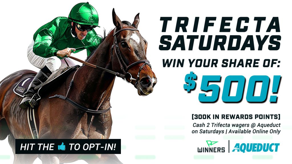 Cash two (2) separate winning trifectas on Saturday’s Aqueduct card and take home your share of $500 (300,000 Rewards points!).