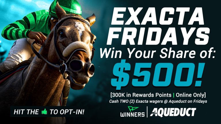 Cash two (2) separate winning exactas on Friday’s Aqueduct card and take home your share of $500 (300,000 Rewards points!).